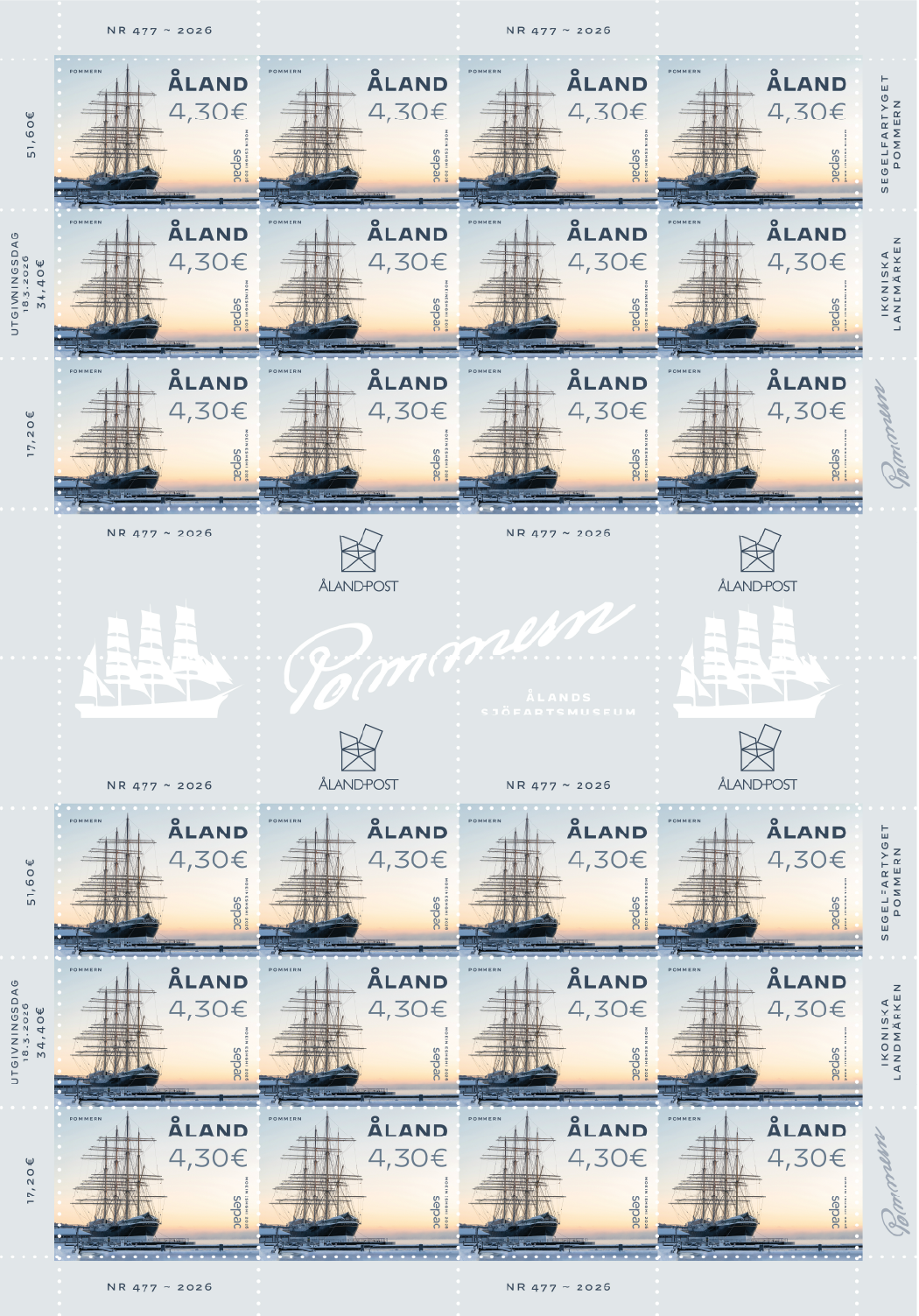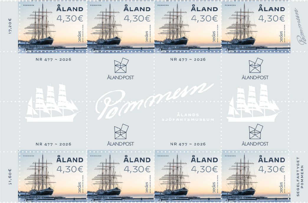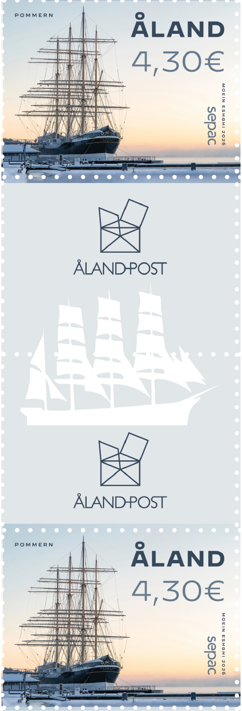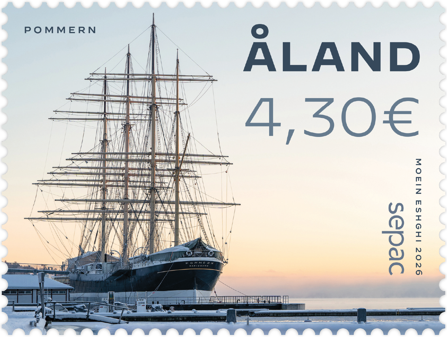 Die Briefmarke zeigt das Museumsschiff Pommern in winterlicher Ruhe. Das Segelschiff ist eine der bekanntesten Sehenswürdigkeiten und stolzes Symbol des maritimen Erbes Ålands.