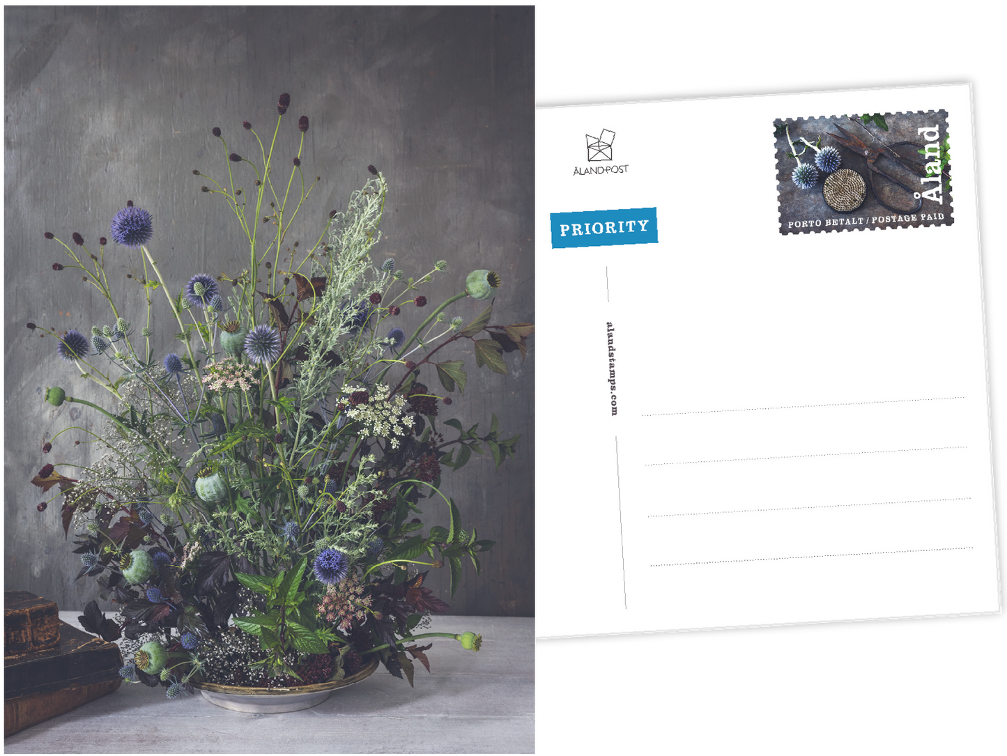 Postage from Åland to the entire world is included in the price of the cards. The postage-paid symbols on the address side of the cards highlight the main motif of each card: glandular globe-thistle, dahlia, sunflower and garden cosmos.