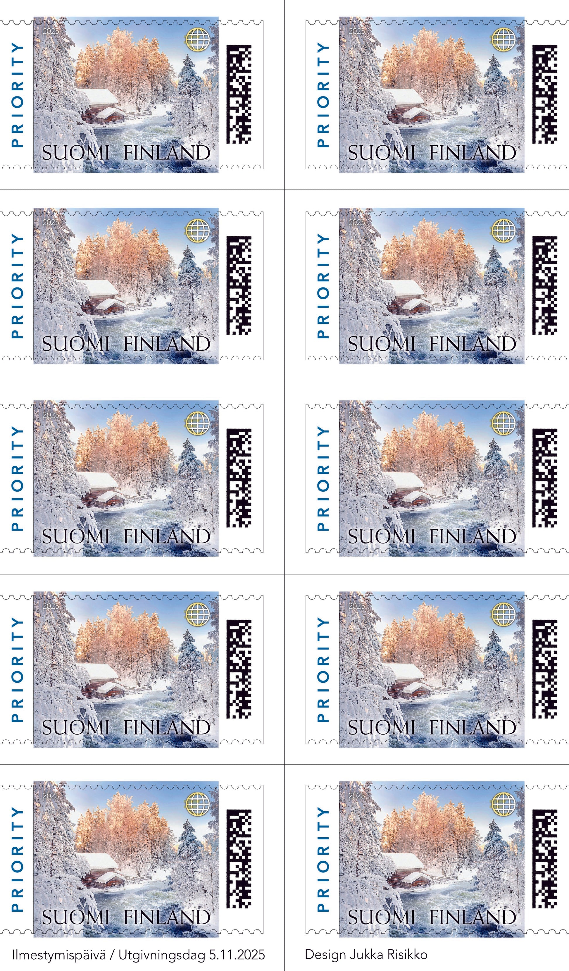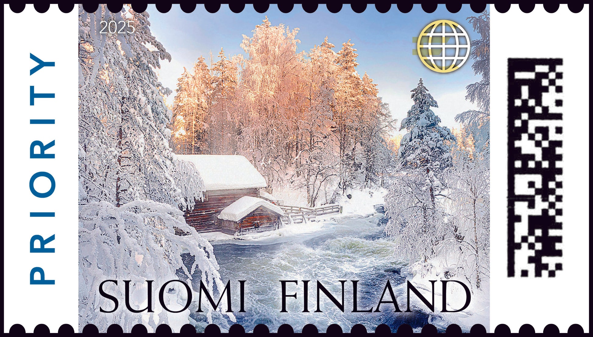The stamp can be used for international winter greetings. The motif was photographed by Jukka Risikko. It features the Myllykoski waterfall on the River Kitkajoki in Kuusamo, where vapor from the rushing water rises in an impressive landscape blanketed in snow and frost.