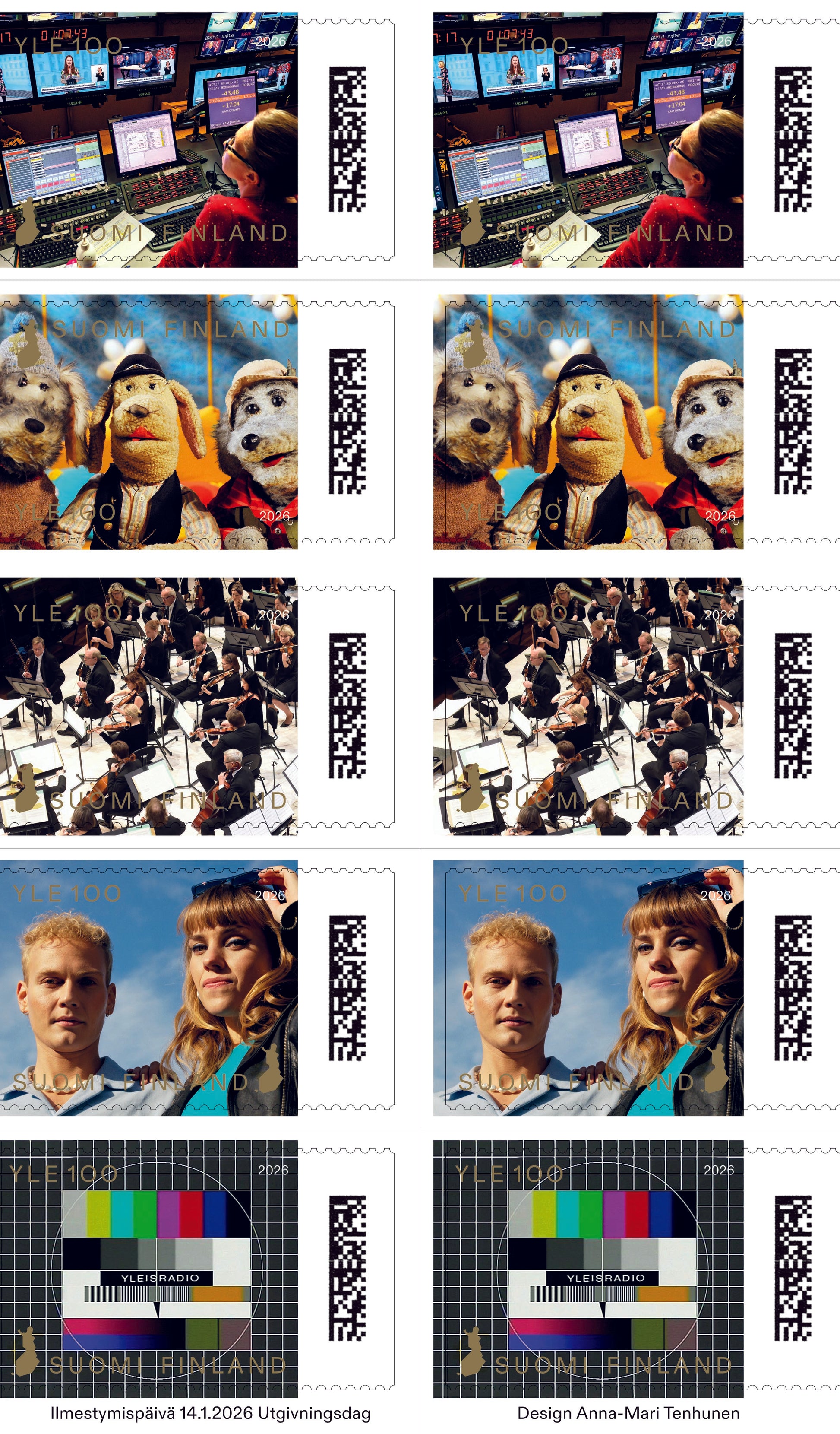 The Finnish national broadcasting company Yle will celebrate its 100th anniversary in September 2026. The theme of the anniversary year is shared moments. Posti Finnland will mark the occasion with stamps designed by Anna-Mari Tenhunen, highlighting different aspects of Yle’s operations – from culture and children’s programmes to drama, production and technology.