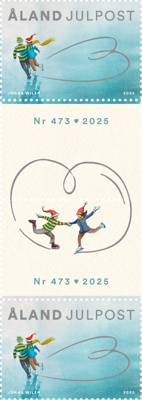 Joulupostimerkki kuvaa rinnakkain luistelemisen iloa.
