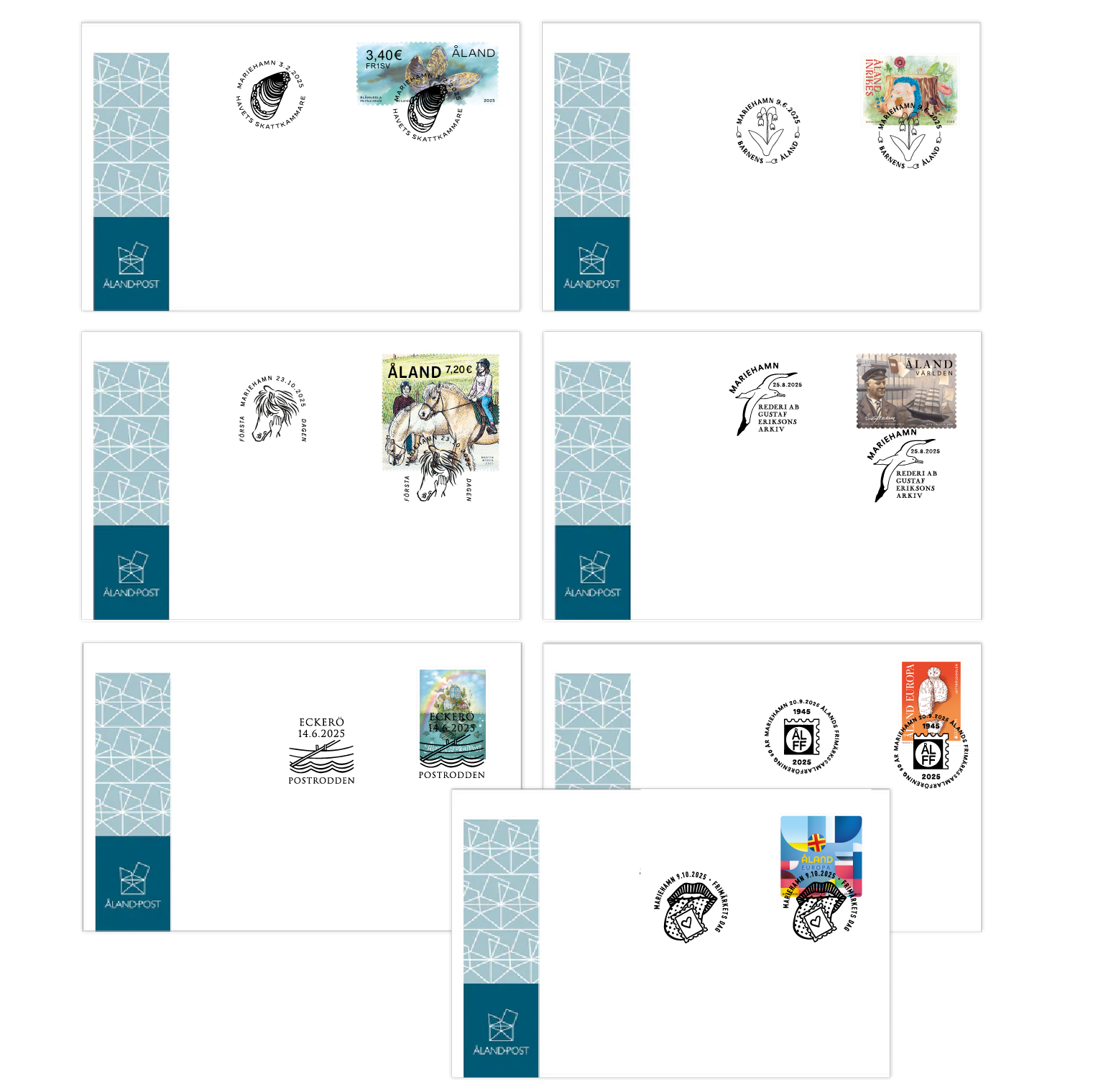 Seitsemää merkkitapausta ja postillista tapahtumaa on juhlistettu omalla erikoisleimalla, joka on ollut käytössä vain yhden päivän ajan. Pakkaus sisältää ahvenanmaalaisilla postimerkeillä varustetut kirjekuoret, jotka on leimattu vuoden 2025 virallisilla muistopostileimoilla.