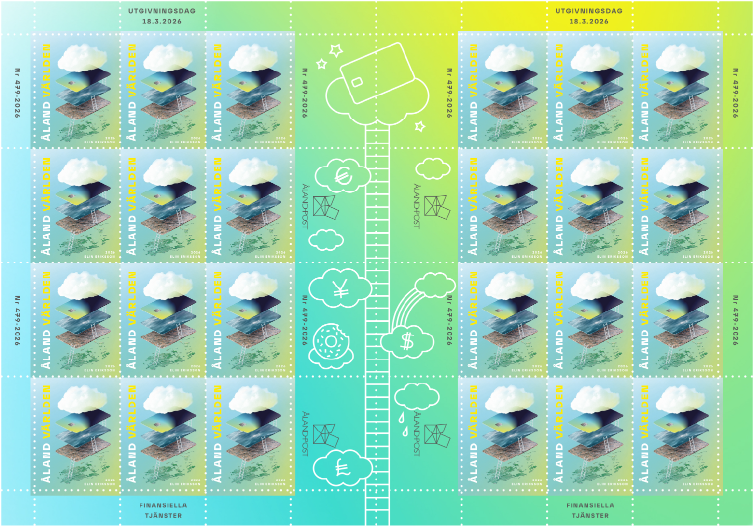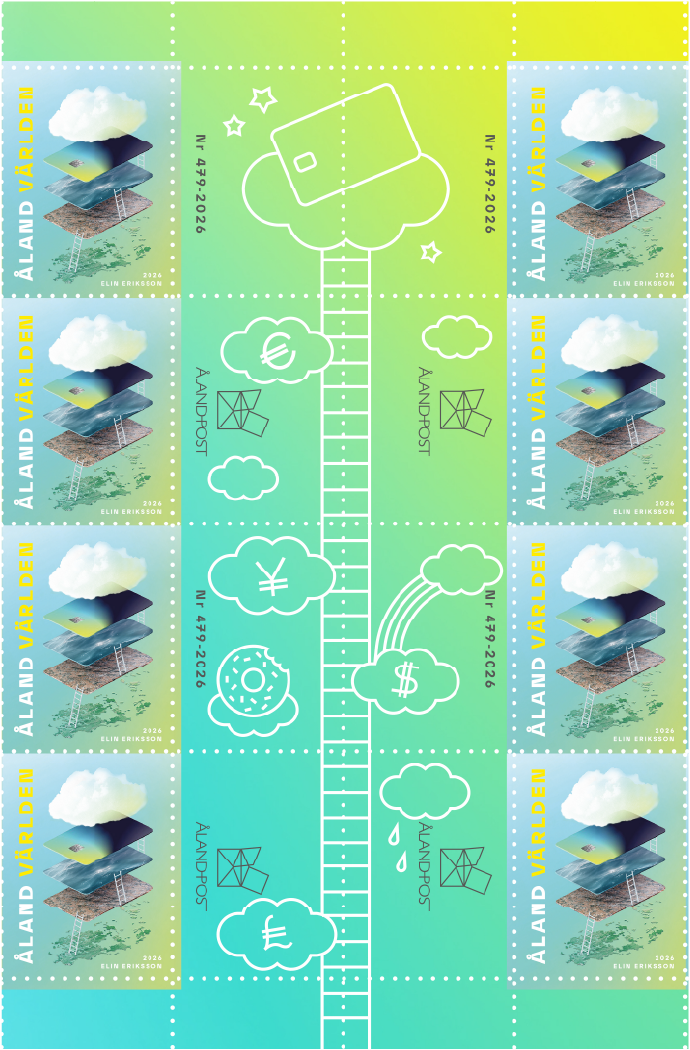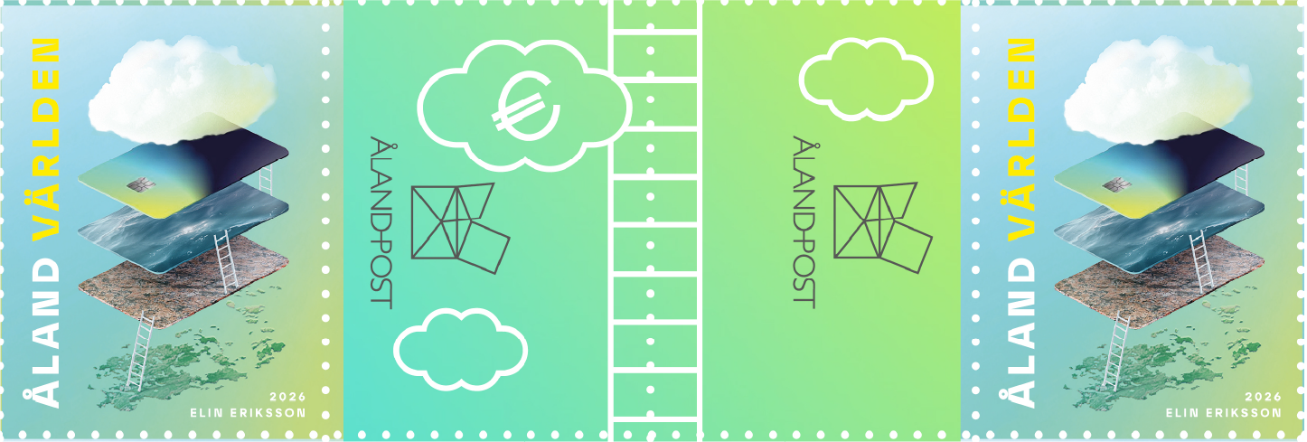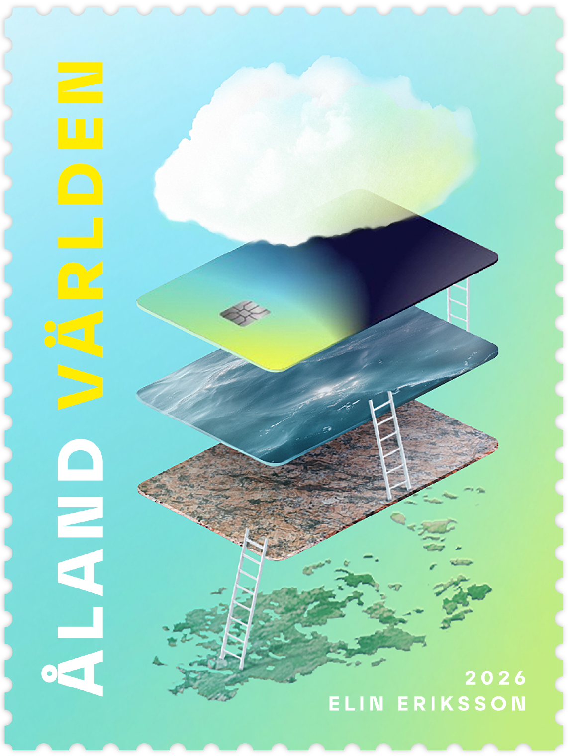 ”Frimärksmotivet bottnar i en stiliserad Ålandskarta som visar de åländska rötterna. Lagren av rödgranit, hav, betalkort och molnet symboliserar vägen ut i världen”, berättar frimärksillustratören Elin Eriksson.