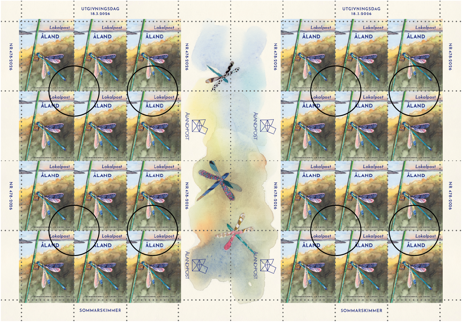 Frimärket Sommarskimmer visar en av våra vanligaste sländor, pudrad smaragdflickslända (Lestes sponsa), på ett grässtrå mot en stiliserad fond av böljande gräs, hav och en kvällssol som delvis gömmer sig bakom molnen. Motivet bygger på en återkommande upplevelse vid sommarstugan på norra Åland.